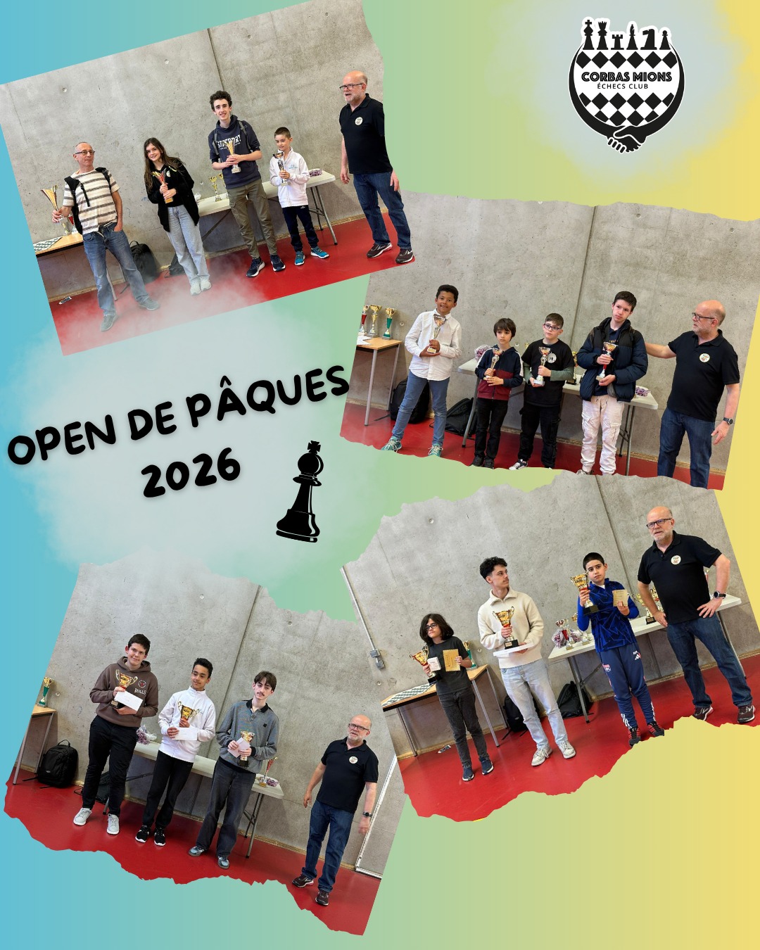 lundi 6 : ronde 6 : 9h30 / ronde 7 : 13h / remise des prix : 16hInscriptions (34 € adultes, 17 € jeunes) obligatoires sur helloasso : https://www.helloasso.com/associations/echecs-club-de-corbas/evenements/tournoi-de-paques-2026-de-corbas