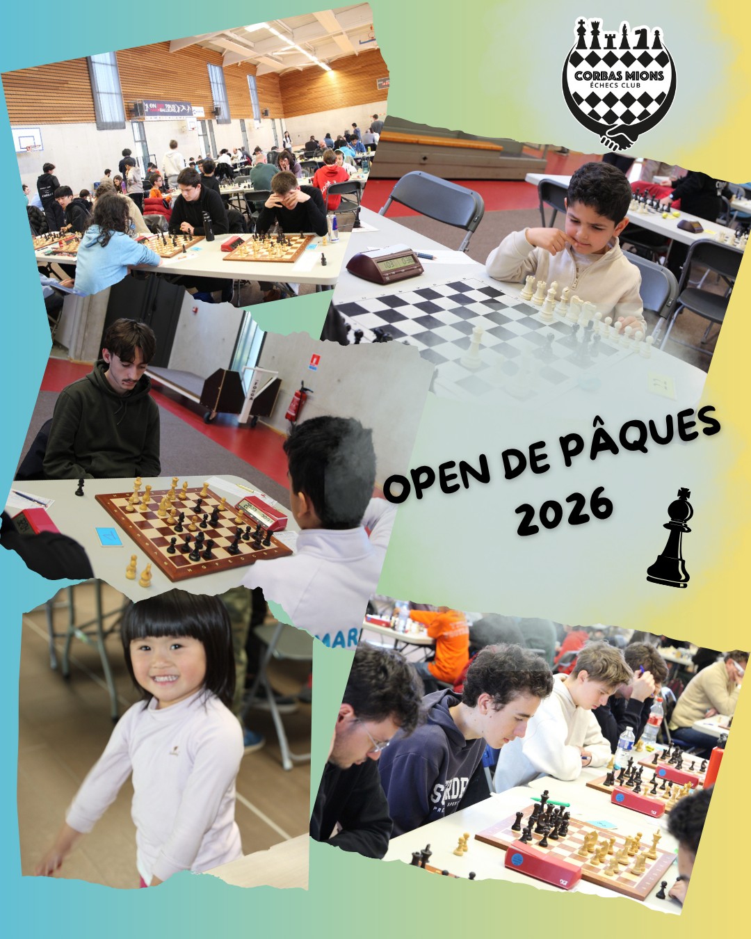 lundi 6 : ronde 6 : 9h30 / ronde 7 : 13h / remise des prix : 16hInscriptions (34 € adultes, 17 € jeunes) obligatoires sur helloasso : https://www.helloasso.com/associations/echecs-club-de-corbas/evenements/tournoi-de-paques-2026-de-corbas